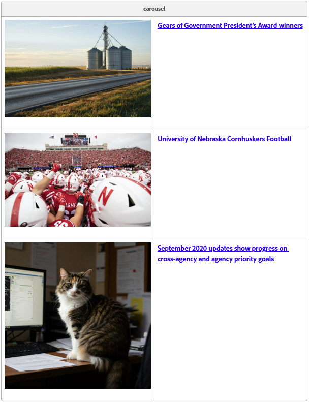 This type of carousel is typically used to display articles on the page. To do that, you need to put the image in the first column and a level 3 heading with a link in the second column of the Carousel block.