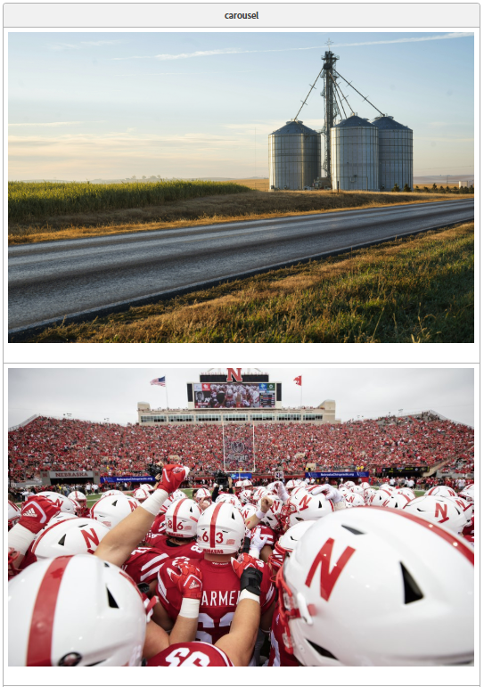 There are two types of carousel blocks: one displays an image and a heading that links to an article page, and one contains only images.